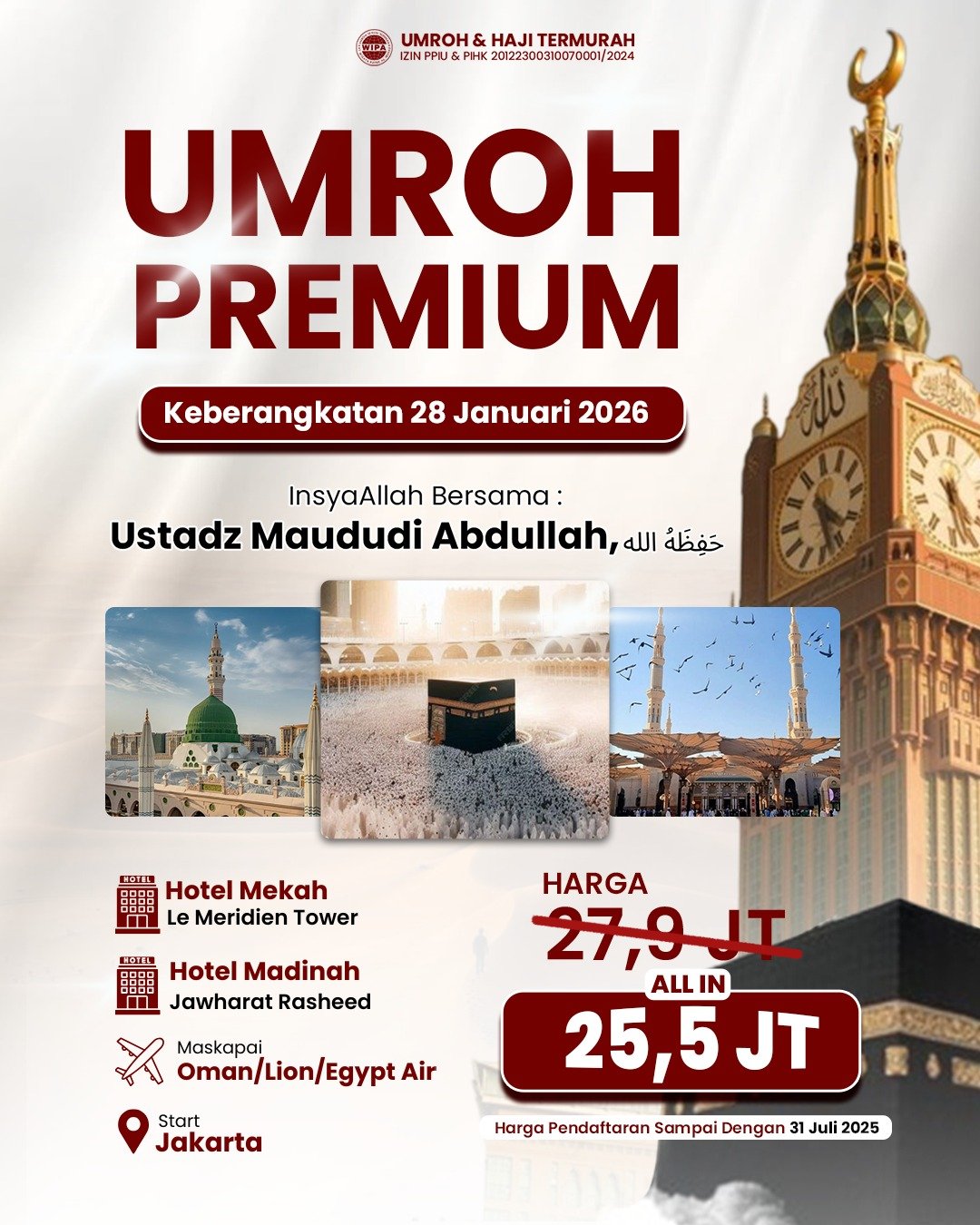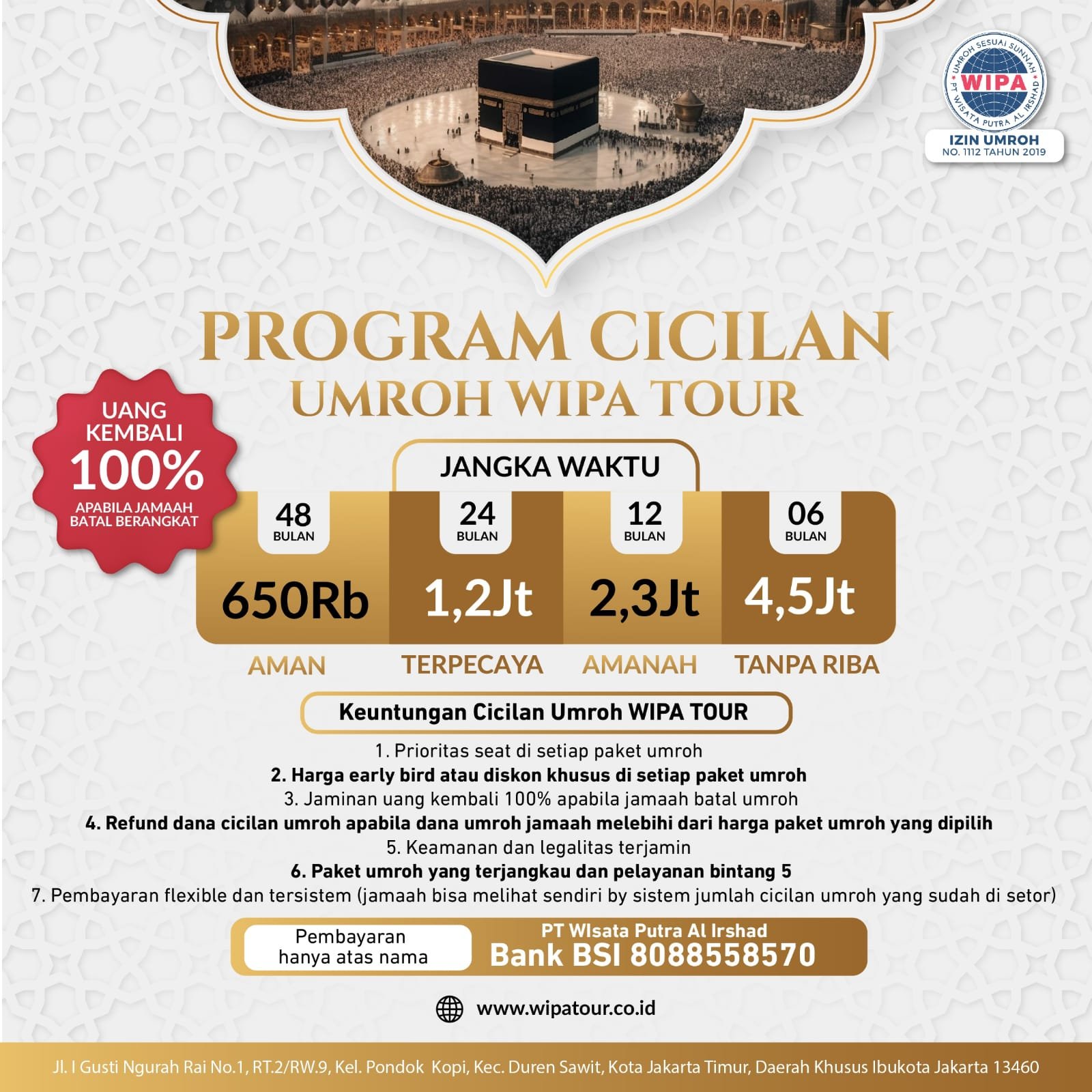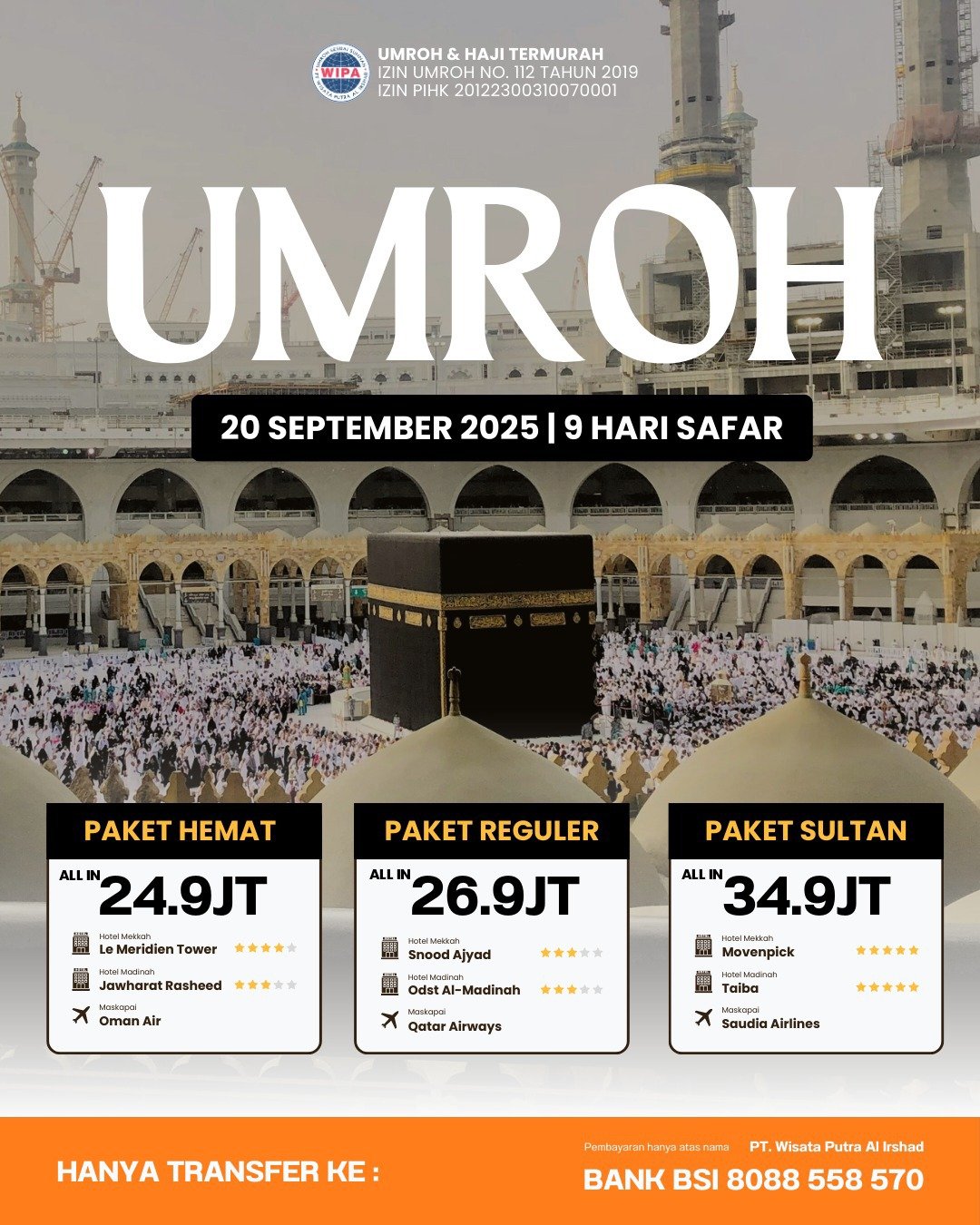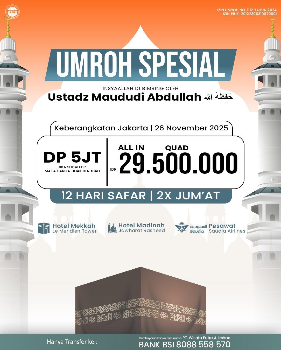 Kami adalah Agen umrah sunnah yang bekerjasama dengan WIPA TOUR (PT. Wisata Putra Al Irshad Travel Haji dan Umroh Bimbingan Ustadz Maududi Abdullah Hafidzohullah. Mari melakukan Ibadah ke tanah suci bersama kami, Ibadah Aman dan Nyaman bersama WIPA TOUR