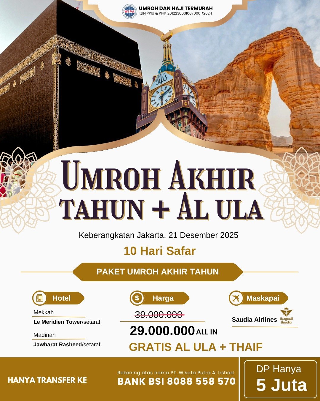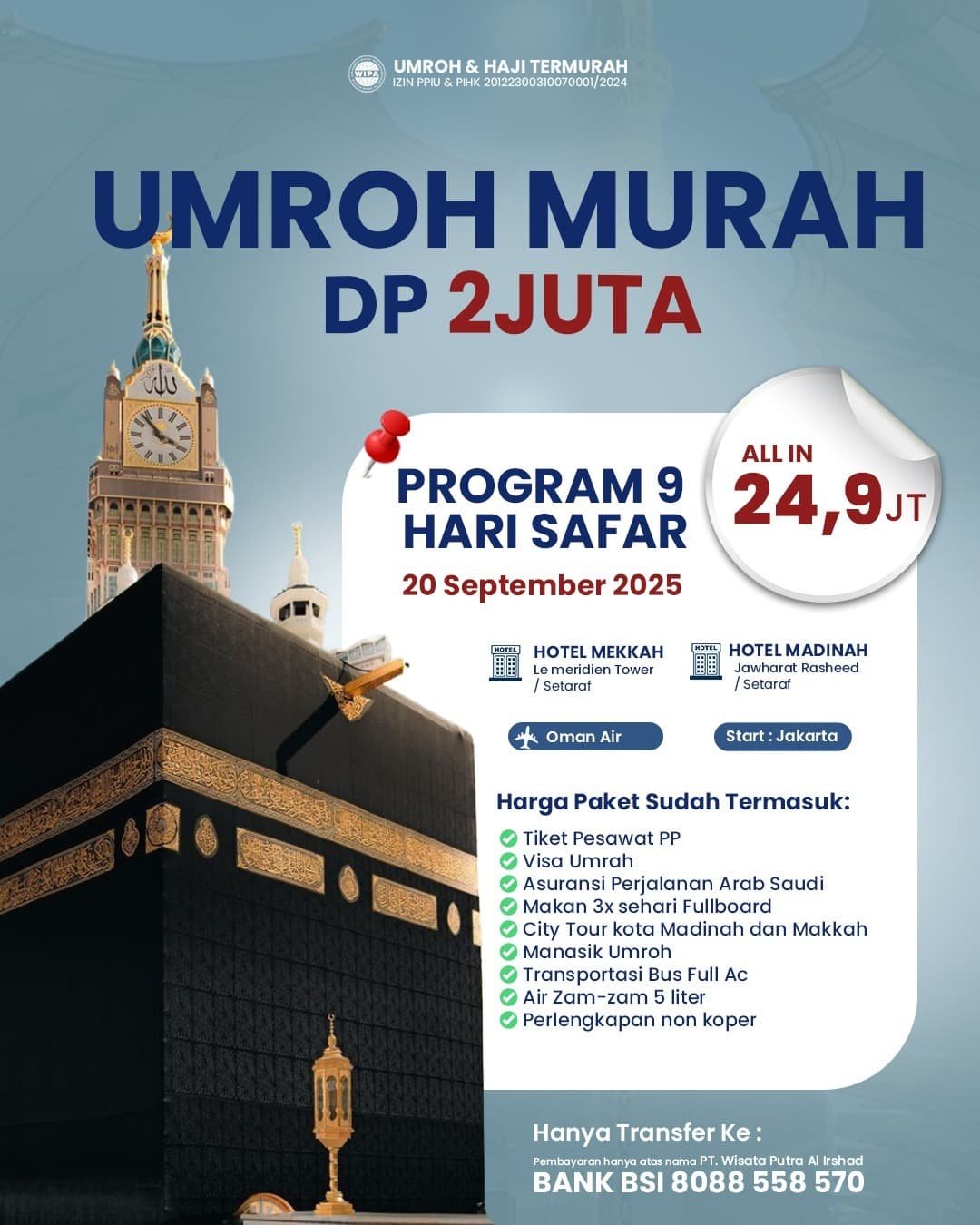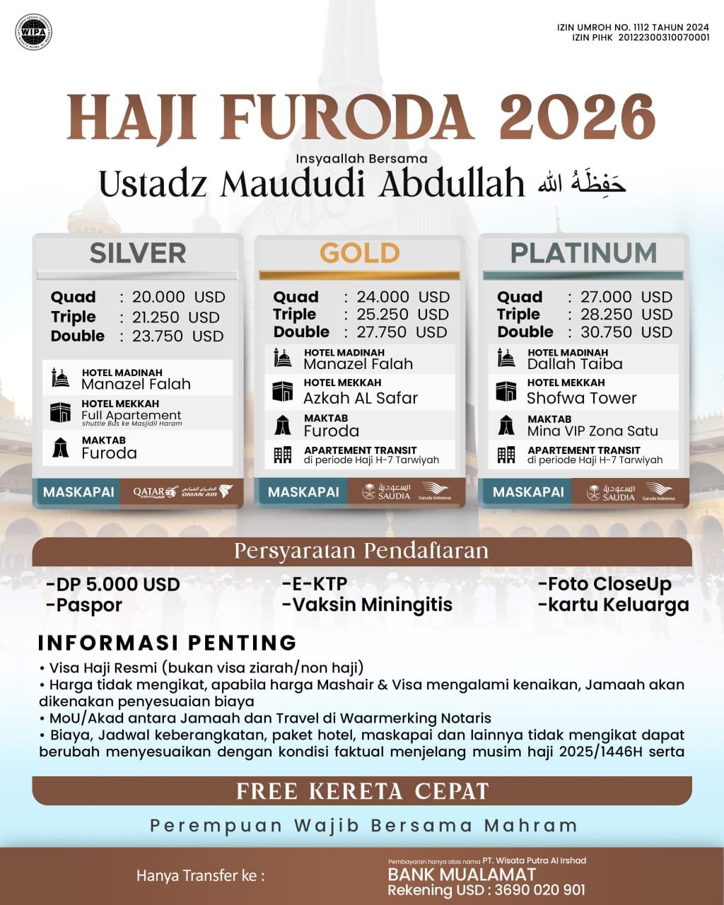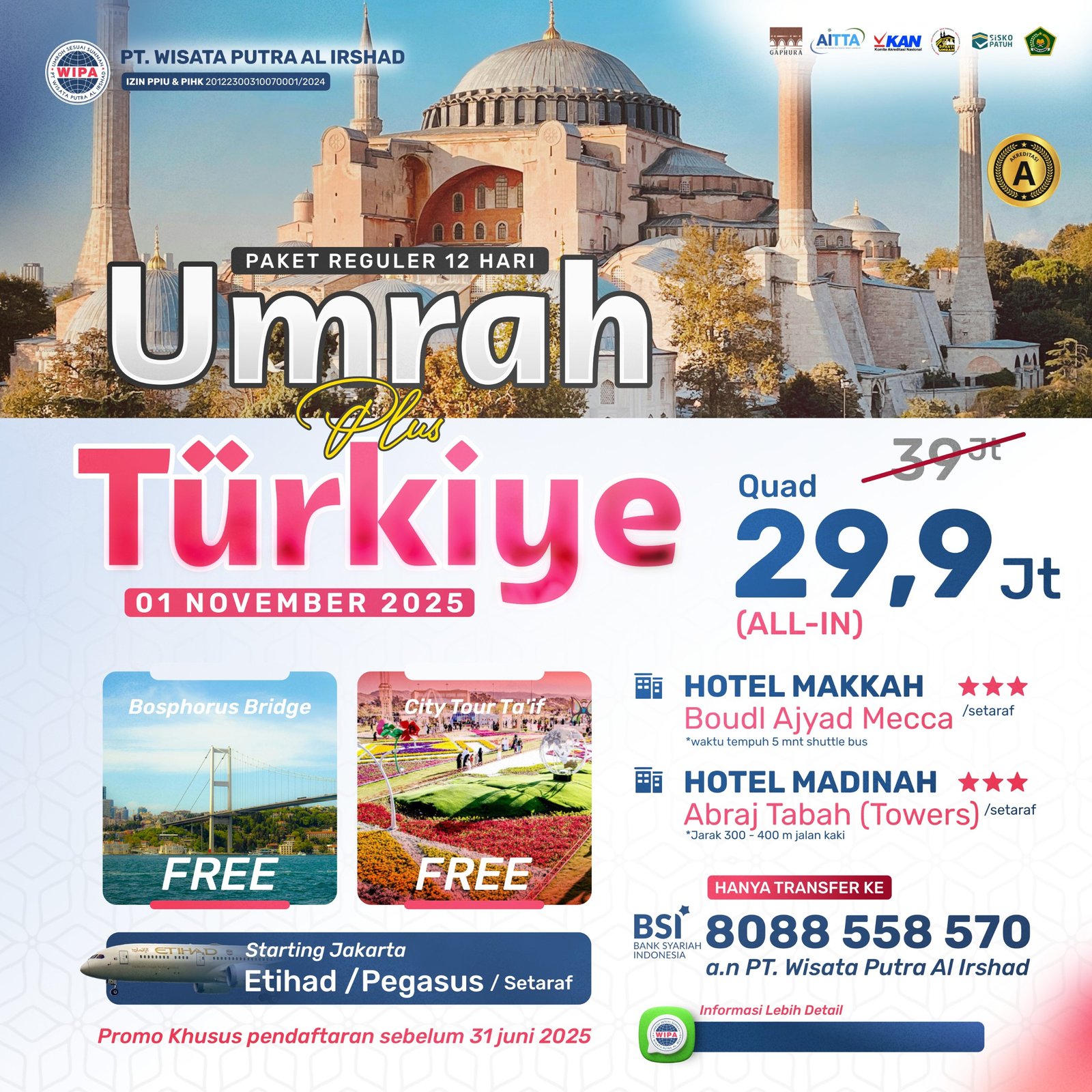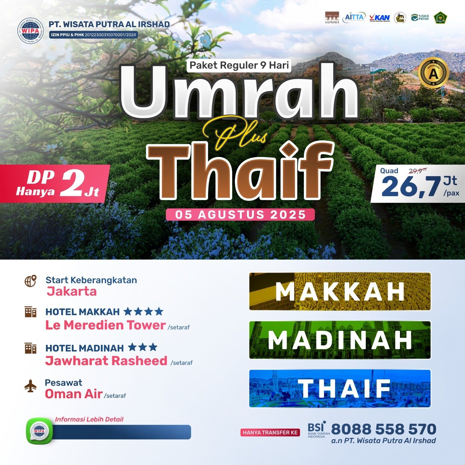 Kami adalah Agen umrah sunnah yang bekerjasama dengan WIPA TOUR (PT. Wisata Putra Al Irshad Travel Haji dan Umroh Bimbingan Ustadz Maududi Abdullah Hafidzohullah. Mari melakukan Ibadah ke tanah suci bersama kami, Ibadah Aman dan Nyaman bersama WIPA TOUR